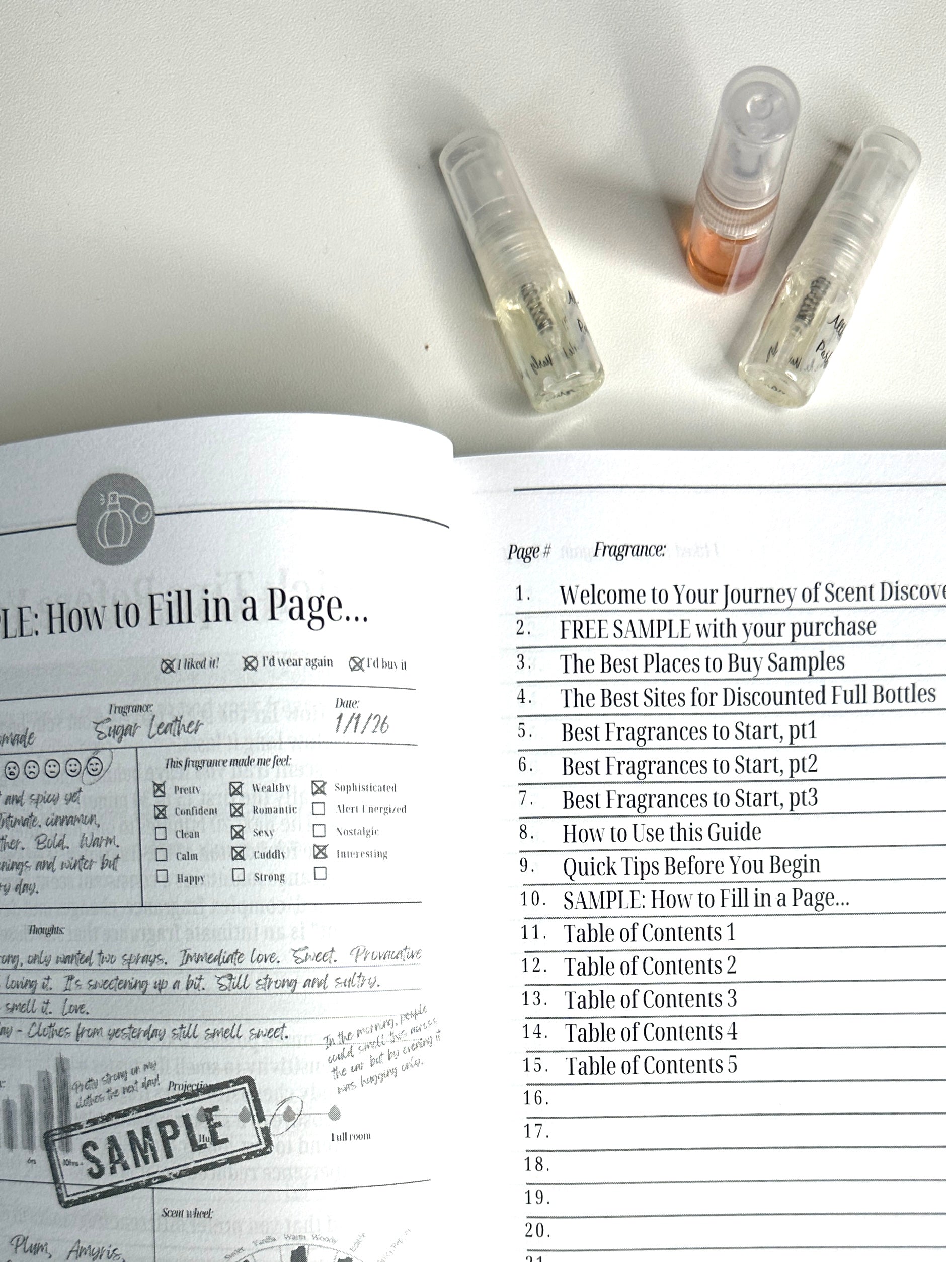 Your bundle includes: Exploring Scents: A Guided Journal for Finding Your Signature Scent. It walks you through tracking impressions, narrowing in on your signature scent, and shopping smarter for full bottles.